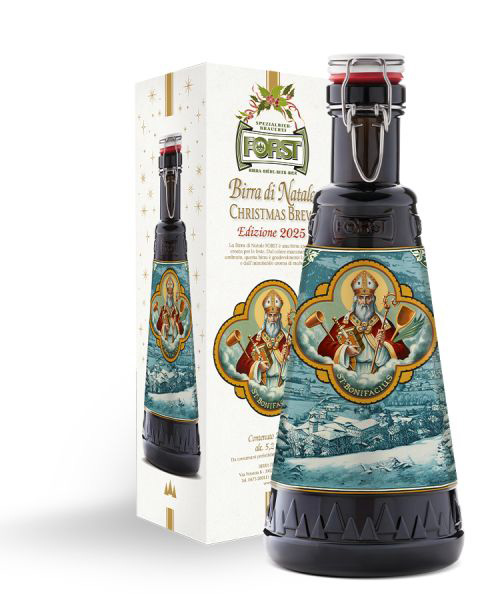 Zur 22. Ausgabe des FORST Weihnachtsbieres in der 2-Liter-Glasflasche wird die Szene von St. Bonifacius, dem Patron der Bierbrauer, kunstvoll eingefangen. Der Heilige, in einem feierlichen roten Umhang, hält Symbole des Brauerhandwerks wie die Bibel, Schaufel und Kelle. Umrahmt von zwei Tannenbäumen und der winterlichen Aussicht auf die Brauerei FORST und die Pfarrkirche von Algund, vermittelt das Etikett eine besinnliche Weihnachtsstimmung. Das Kunstwerk spiegelt auch das Jubiläumsjahr 2025 der katholischen Kirche wider. Die Glasflasche enthält das festlich-herbe Weihnachtsbier – ein wahres Meisterwerk!
