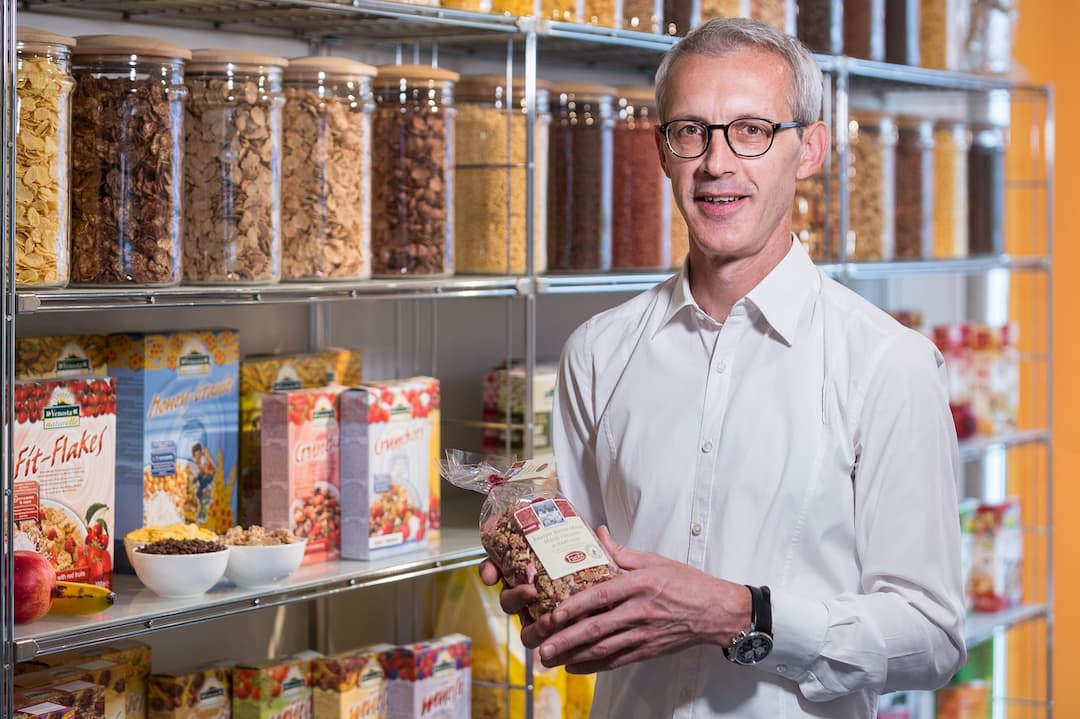 Haferflocken, Milch- und Zartbitterschokolade 16% (Zucker, Vollmilchpulver, Kakaomasse, Kakaobutter, Emulgator: Sojalecithin), WEIZENVOLLKORNFLOCKEN, Choco-Crumpies [Getreidemehle (Mais, Reis, WEIZEN), Zucker, fettarmes Kakaopulver, Gerstenmalzextrakt, Salz, Glucosesirup, Aromen, Zimt], Choco-Flakes (Maismehl, Zucker, Gerstenmalzextrakt, fettarmes Kakaopulver, Salz, Glucosesirup, Aromen, Zimt), Bananen 1,6% (Bananen, Kokosnussöl, Zucker), Honig 1%, Haselnüsse 1%, Zitronenflocken.