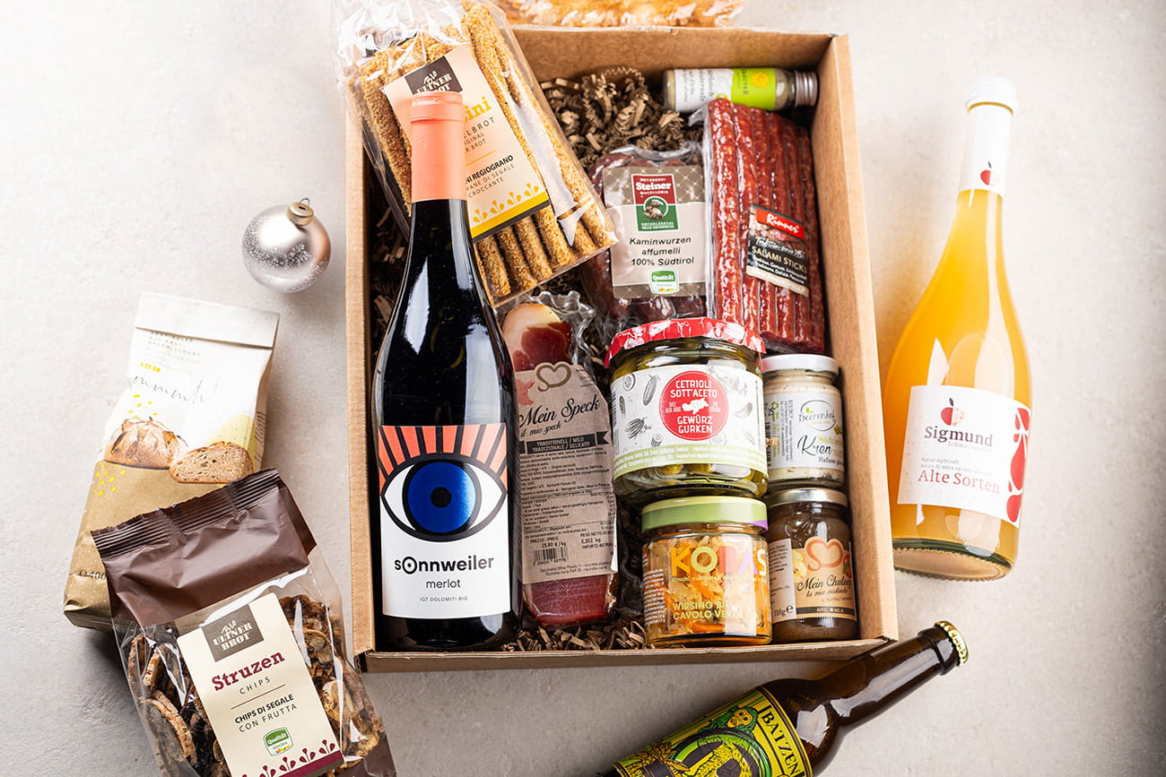 Merlot Bio Sonnweiler, Kellerei Meran, Schüttelbrot Gasser, Backmischung Vitalpina, Bier Free Monkey Batzen Bräu, Schüttelbrot Laugen bio Ultner Brot, Kimchi Kobas, Gewürzgurken Lechner, Speck des Hauses Metzgerei Hofer, Kren Naturscharf Beerenhof, Südtiroler Bärlauchsalz Kräuterschlössl, Chutney Birne Ah!Natur, Struzenchips bio Ultner Brot, Apfelsaft Alte Sorten Sigmund Schwarzielhof, Kaminwurzen g.g.A. "100 % Südtirol" Metzgerei Steiner, Salamisticks Metzgerei Rinner