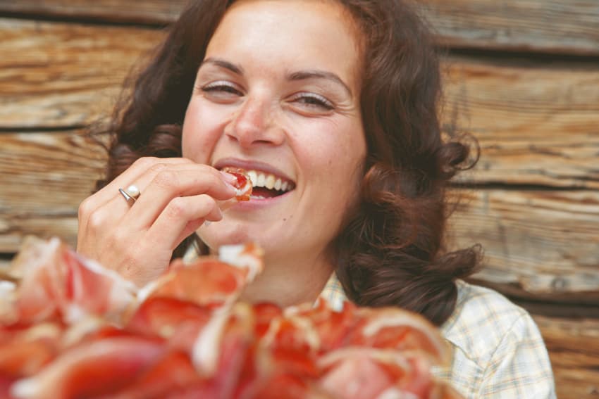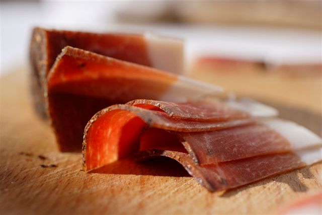 4,97 von 5 möglichen Punkten hat der Gourmet Speck von Schmid Speck aus Plaus bei der Speckvergleichsverkostung erzielt. Hauchdünn also an Gold vorbeigeschlittert. Der Gourmet Speck, so erklärt uns Thomas Schmid, wird ausschließlich mit ausgewachsenen, großen Hausschweinen mit einem Gewicht von rund 150 Kilogramm hergestellt. Die Schweine stammen allesamt aus der Poebene, wachsen natürlich auf und werden mit Gerste, Parmesanmolke oder Mais aufgezogen. Die Tatsache, dass das Fleisch außergewöhnlich lange Zeit zum Ausreifen bekommt – eineinhalb bis zwei Jahre – verleiht dem Fleisch eine unverwechselbare feine, süßliche Note und macht es zudem leicht verdaulich. Der Gourmet Speck präsentiert sich elegant mit feinen Räuchernoten und darf – auch das ungewöhnlich – neun bis zehn Monate reifen, bevor er den Konsumenten angeboten wird.