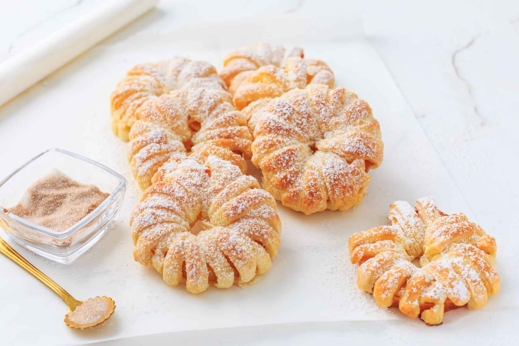 Apfelringe mit verquirltem Ei bestreichen und mit Zimt-Zucker bestreuen.