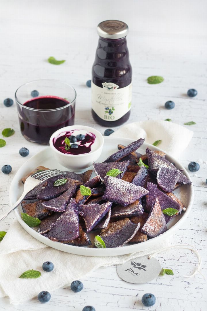 „Die Idee hinter diesem Rezept, war es, einem herzhaft süßen Klassiker der Alpenküche mit dem Heidelbeere Smoothie von Alpe Pragas etwas Farbe und Frucht zu verleihen.“ – Cristina Mauri