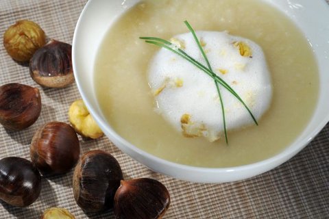 2. geschälte Sellerieknolle in Würfel schneiden und mit den Kastanien zu den Schalotten geben, alles gut durchrösten und mit Gemüsebrühe aufgießen