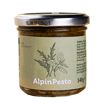 Basilico, rucola e prezzemolo donano una vigorosa nota verde, mentre i pomodori maturati al sole, il saporito Trentingrana e le delicate noci creano un condimento versatile dal carattere alpino. Perfetto con la pasta, come crema spalmabile o per arricchire piatti e antipasti, è fresco, deciso e dal gusto inconfondibile. Alpin Pesto: la composizione di erbe aromatiche che unisce il cuore delle Alpi al tocco del Mediterraneo.