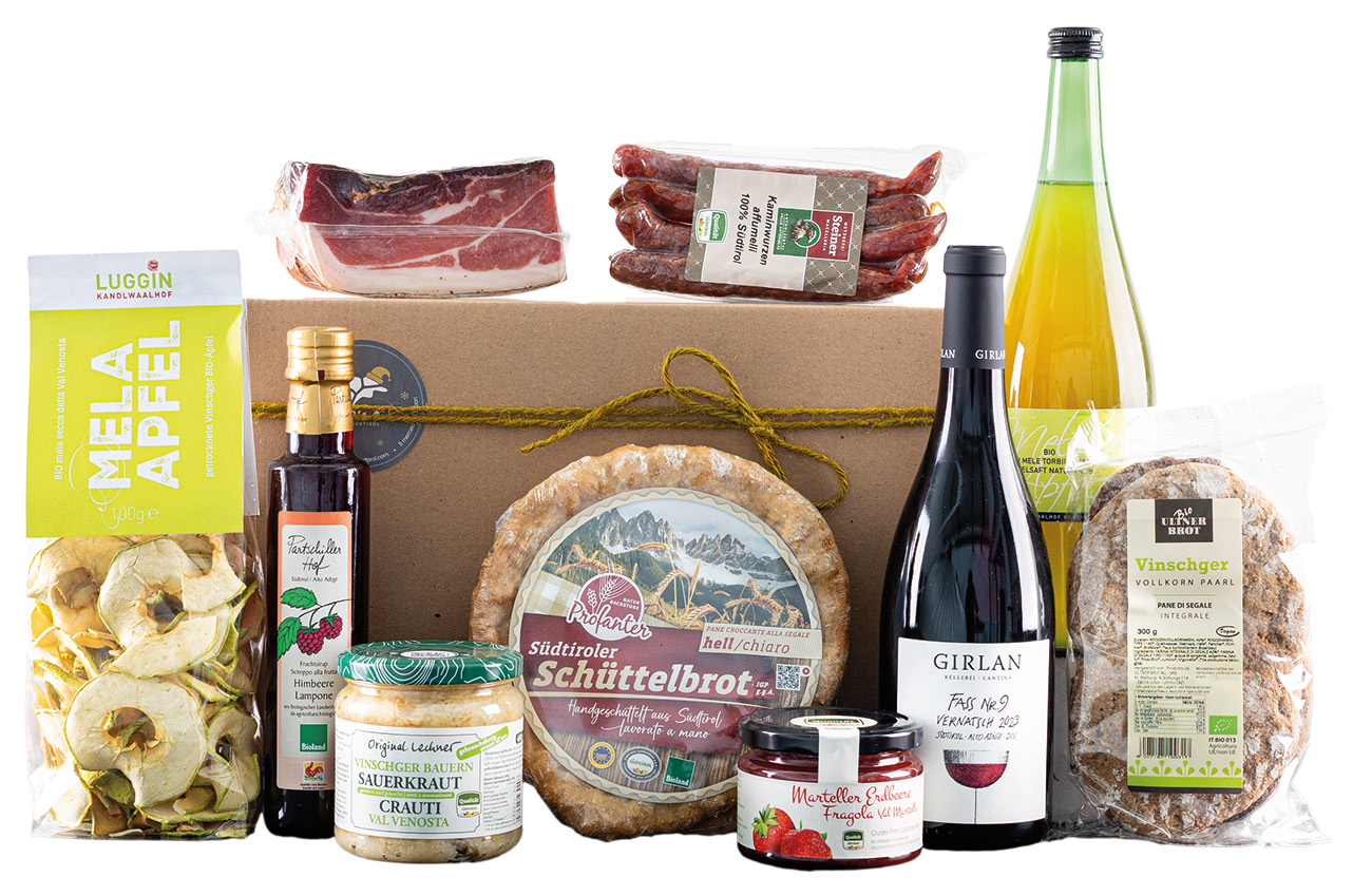 Mele essiccate, Kaminwurzen, Speck, Composta di frutta, Pane croccante, Crauti della Val Venosta, Succo di mela, Pane integrale di segale, sciroppo di frutta