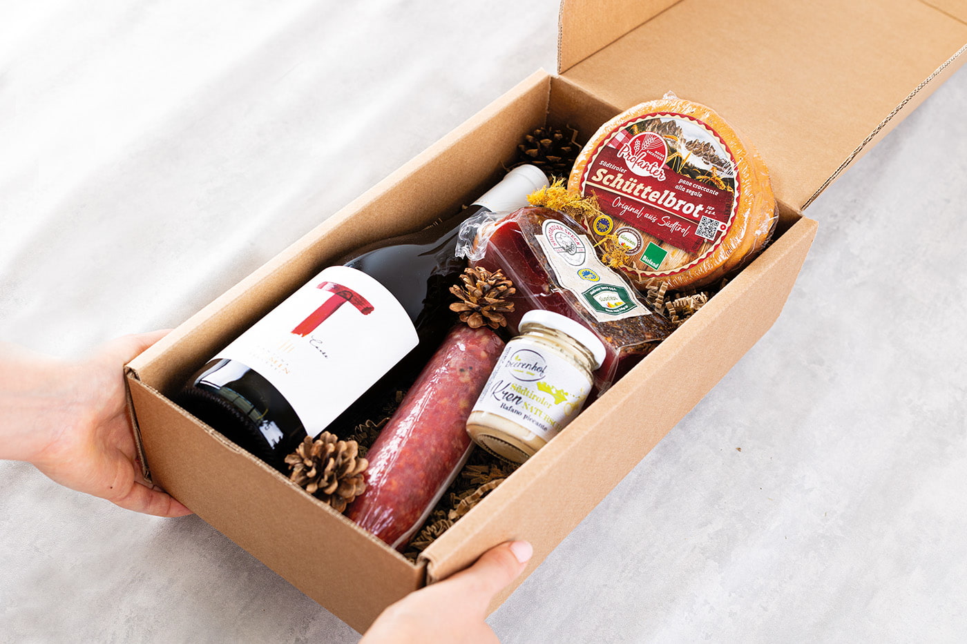 Speck, Schüttelbrot Pane croccante di Segale, Salame, Rafano, Vino rosso
