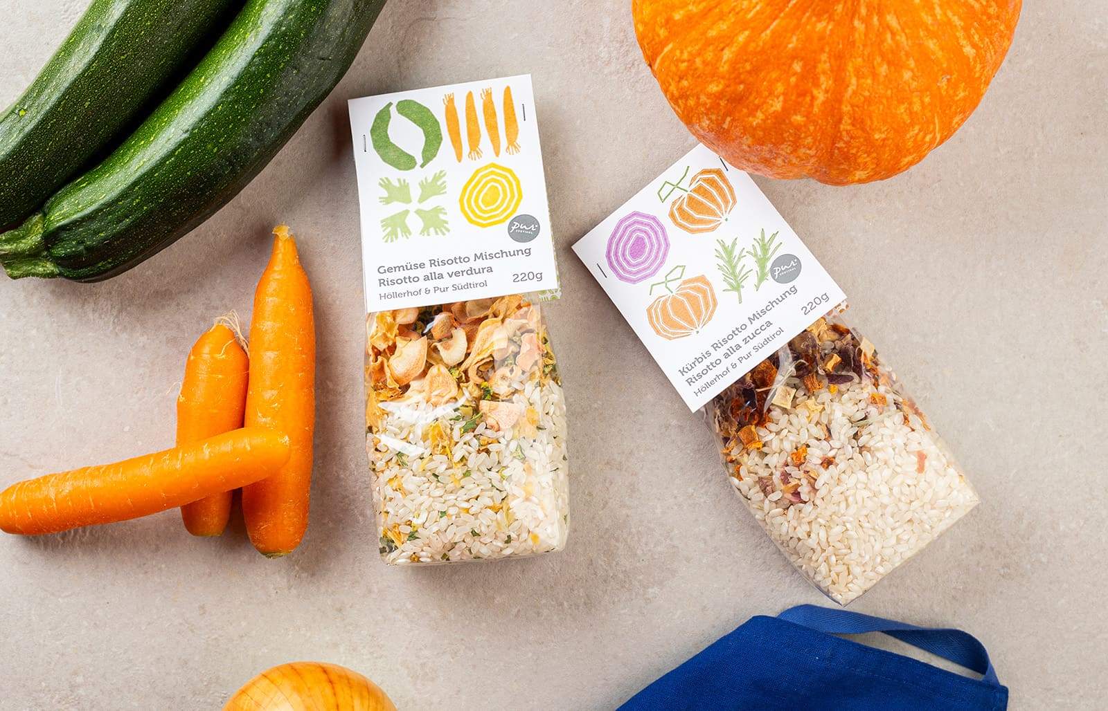Se non hai tempo per tanti dettagli e vuoi comunque affidarti alla qualità altoatesina e alla passione italiana, puoi ricorrere alle miscele per risotto dell'Alto Adige Höllerhof e di PUR Südtirol. Tutto è già pronto! Naturalmente, ti tocca ancora mescolare.