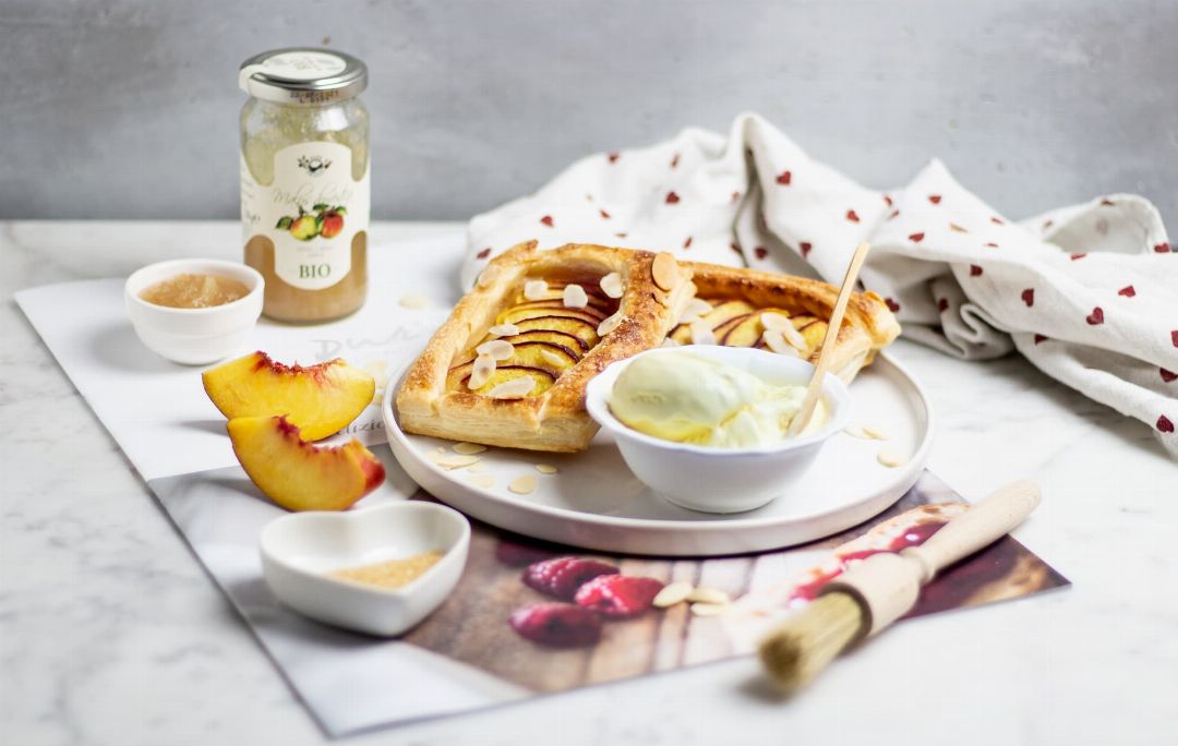 Suggerimenti in cucina: Le sfogliatine di pesche con confettura di mele bio sono ottime da servire con qualche pallina di gelato al fior di latte o al gusto crema!